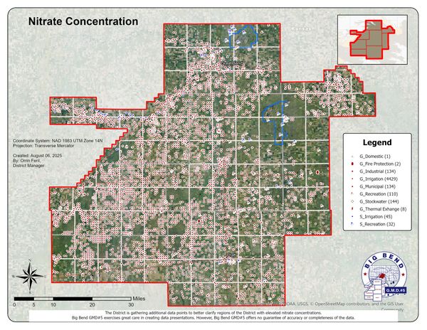 Early KGS studies have indicated elevated nitrate concentrations in the groundwater of the District (Townsend & Young, 1995). The District is currently gathering additional data points and coordinating with KDHE to better clarify the regions within the District with elevated nitrate concentrations. Until such a time that a narrower area can be identified, the District is conducting a District-wide effort to inform and encourage all water users to collect and analyze their water wells for nitrate concentrations. The District is providing water bottles for public and private use to bring water samples to the District lab for analysis. The District laboratory is not KDHE-certified, but this provides a quick and economical assessment for the public while allowing the District to collect water quality data from across the District. Once more data is collected, this can be analyzed to determine focused areas impacted by elevated nitrate concentrations. Since the District has not yet received a sufficient number of samples for analysis, effective identification of Priority Areas for nitrate concentrations is not possible.