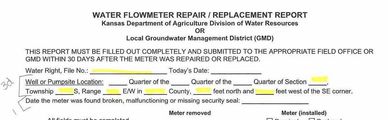 When water flowmeters are repaired or replaced, K.A.R. 5-1-10 requires the water right owner, or the water right owner's authorized designee, to notify the chief engineer. The Flowmeter Repair/Replacement form (DWR 1-560) must be used to provide the required information.
